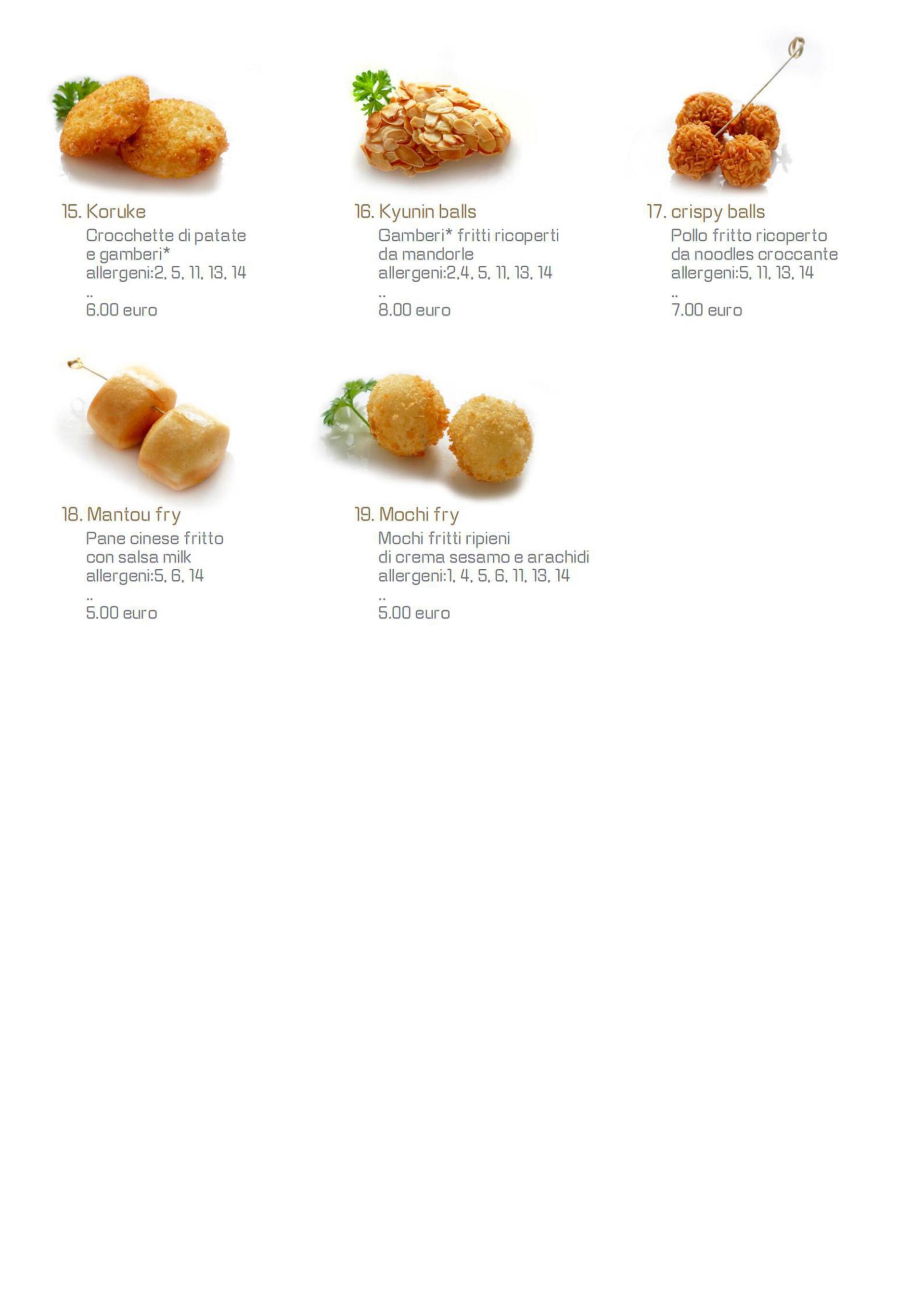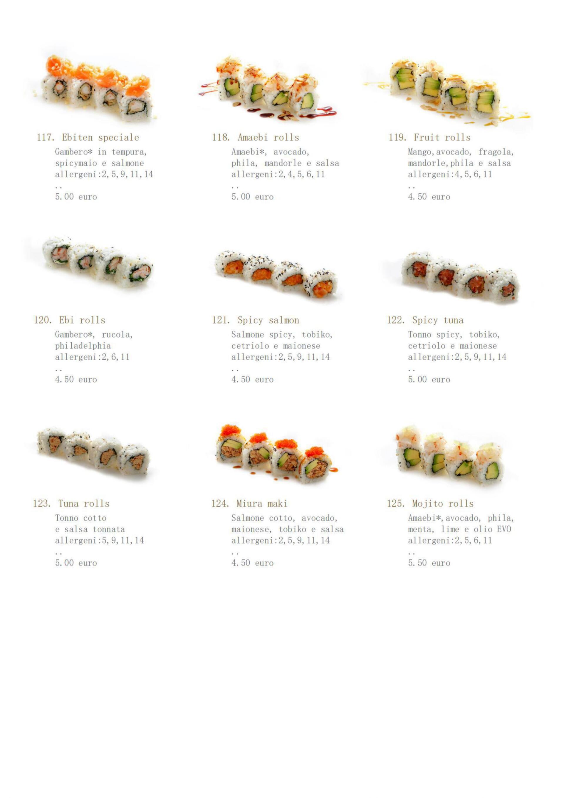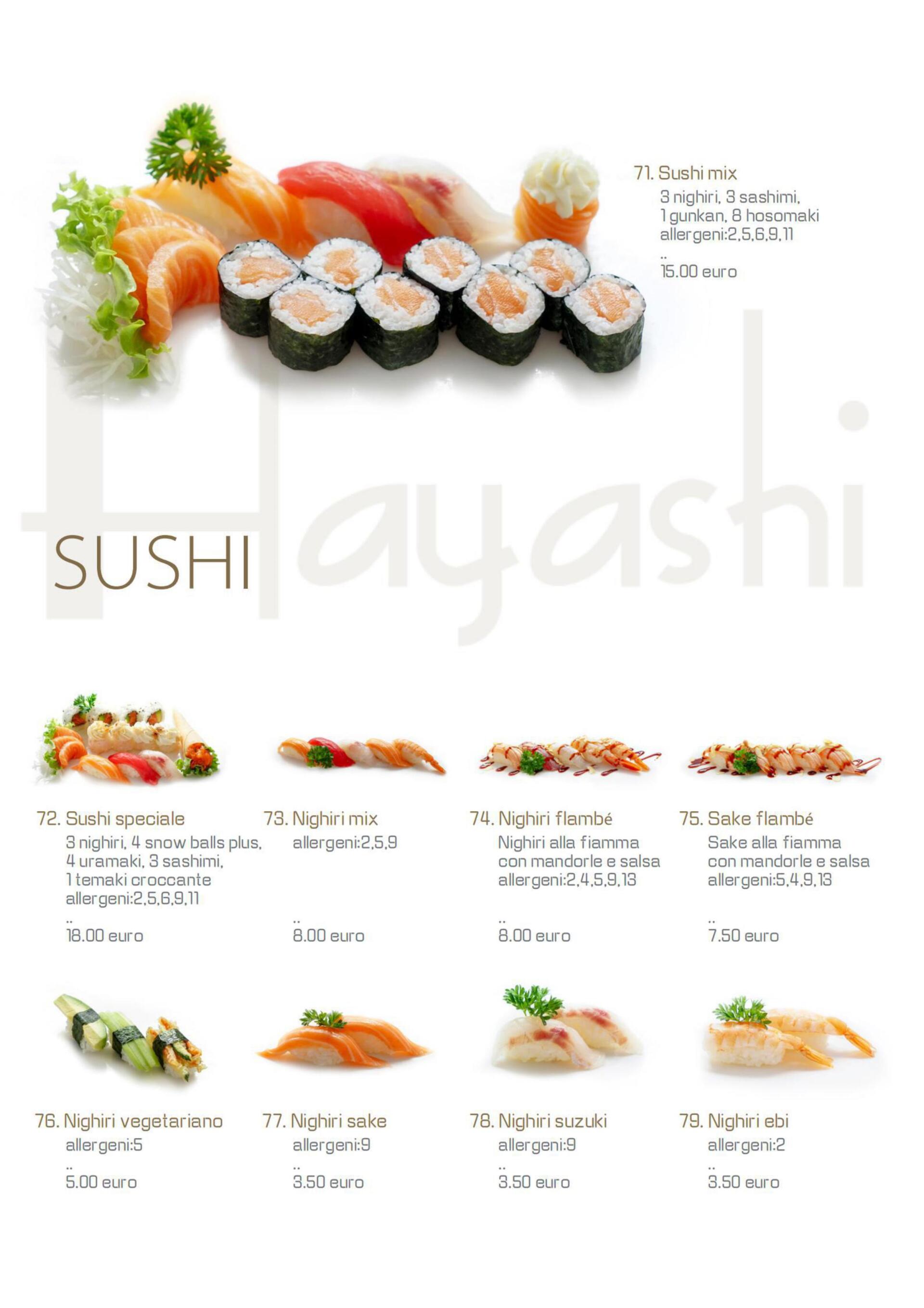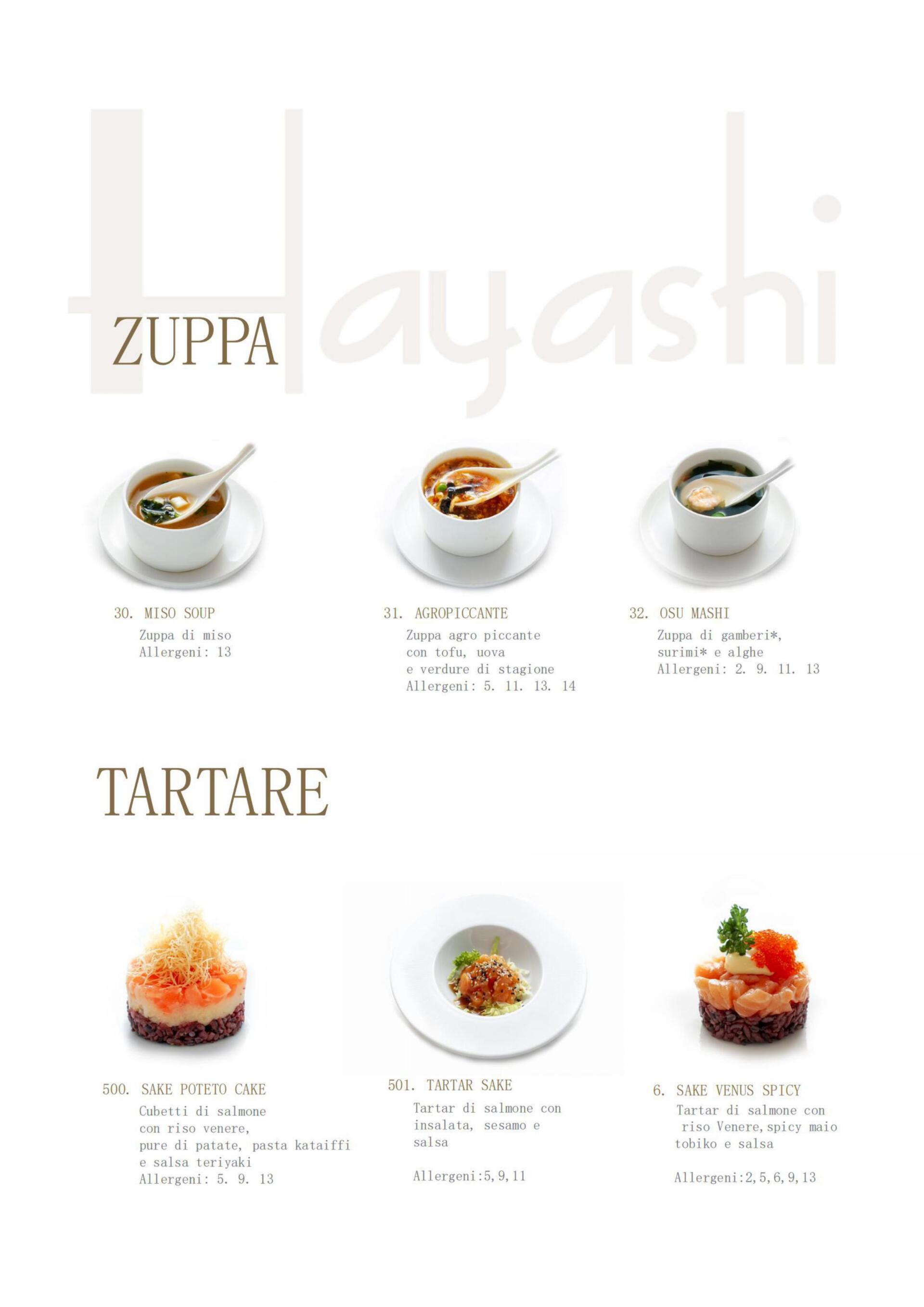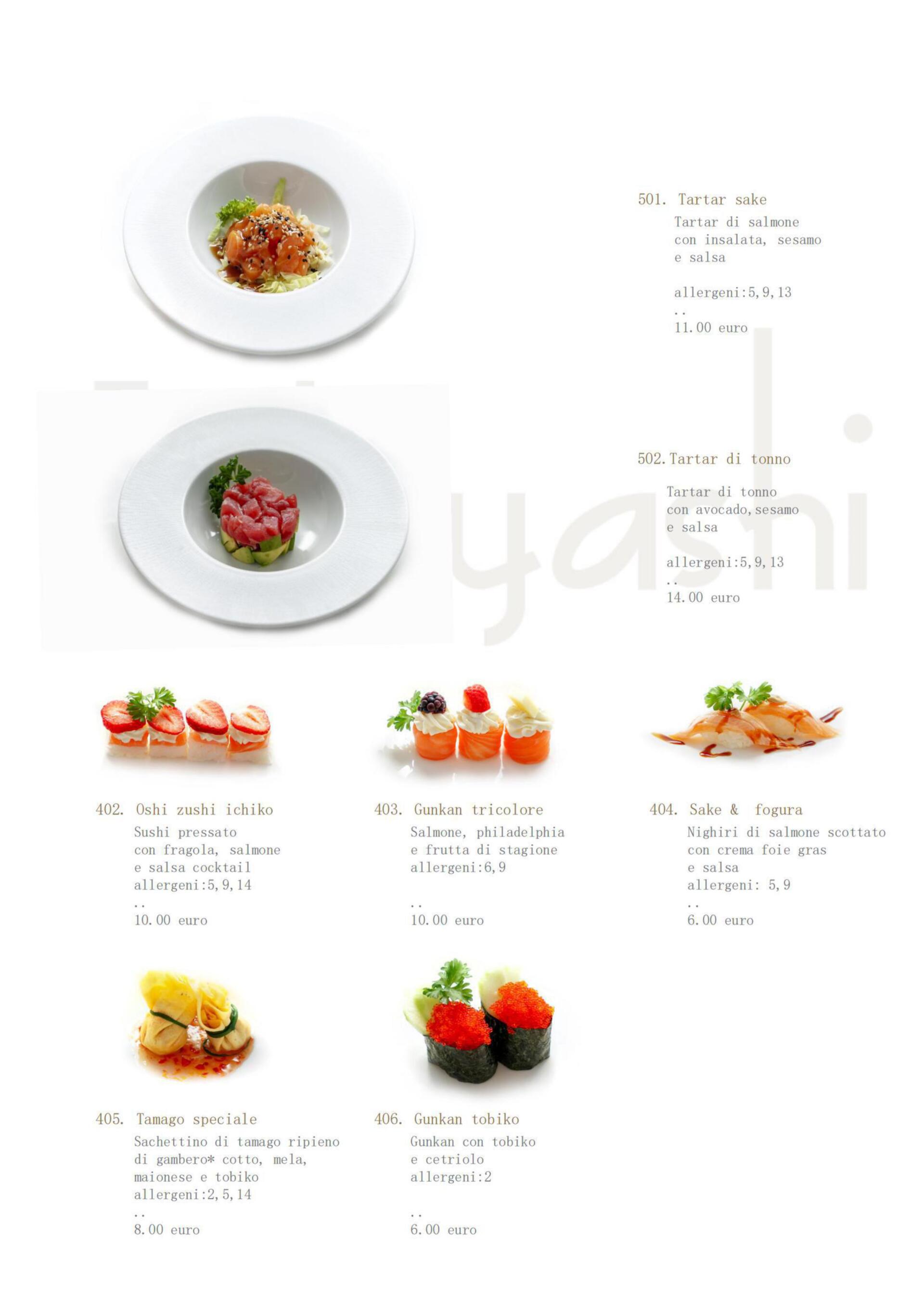 Nel menù troverete antipasti giapponesi e asiatici, primi e secondi piatti orientali, cucina cinese, sushi e sashimi in sfiziose varianti, tempura, zuppe e insalate, piatti e dolci fusion, bevande tipiche, birre e vini pregiati.