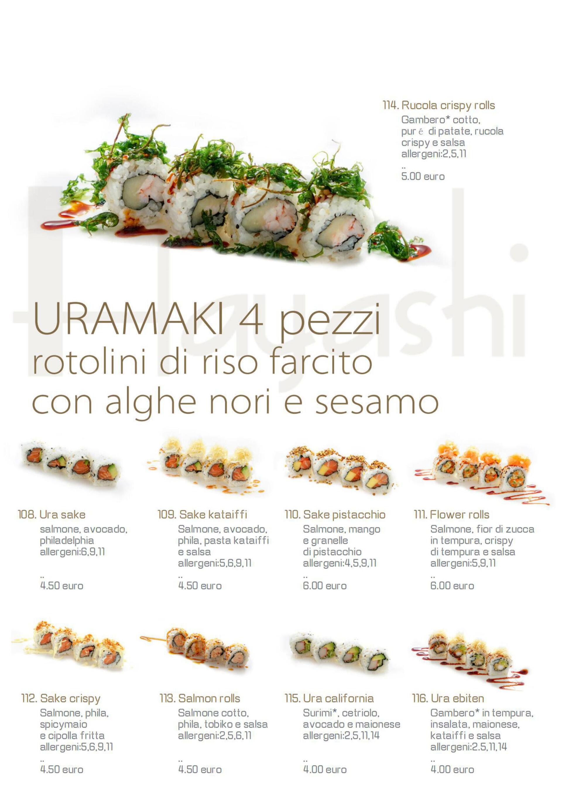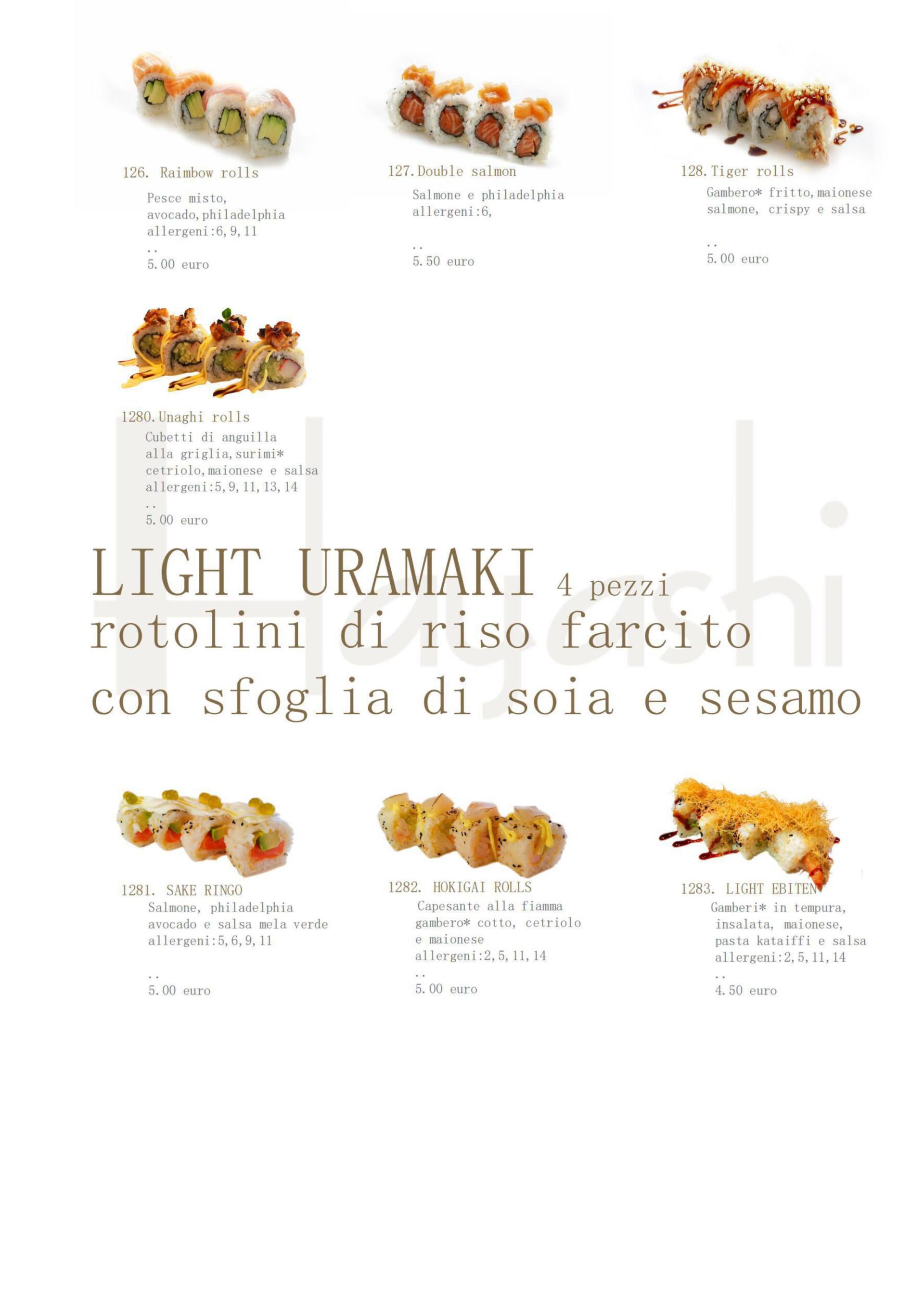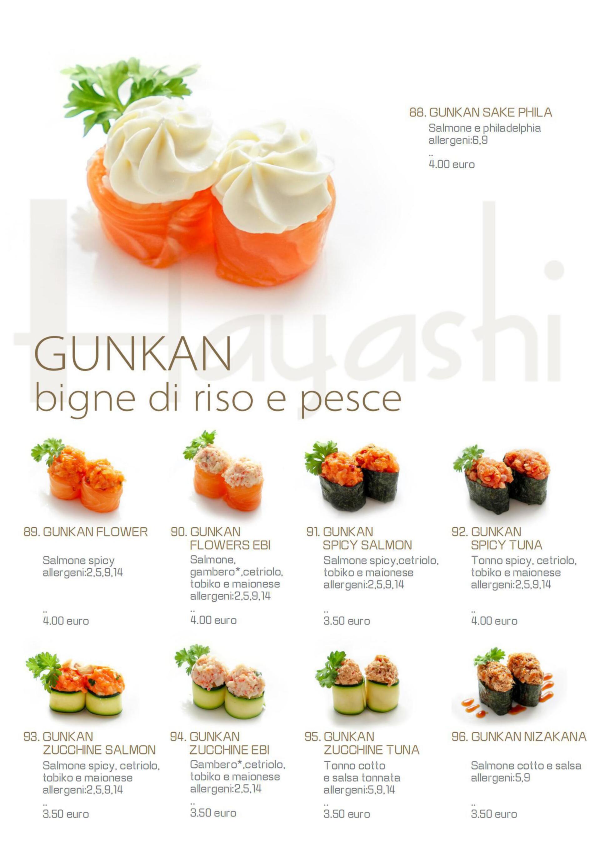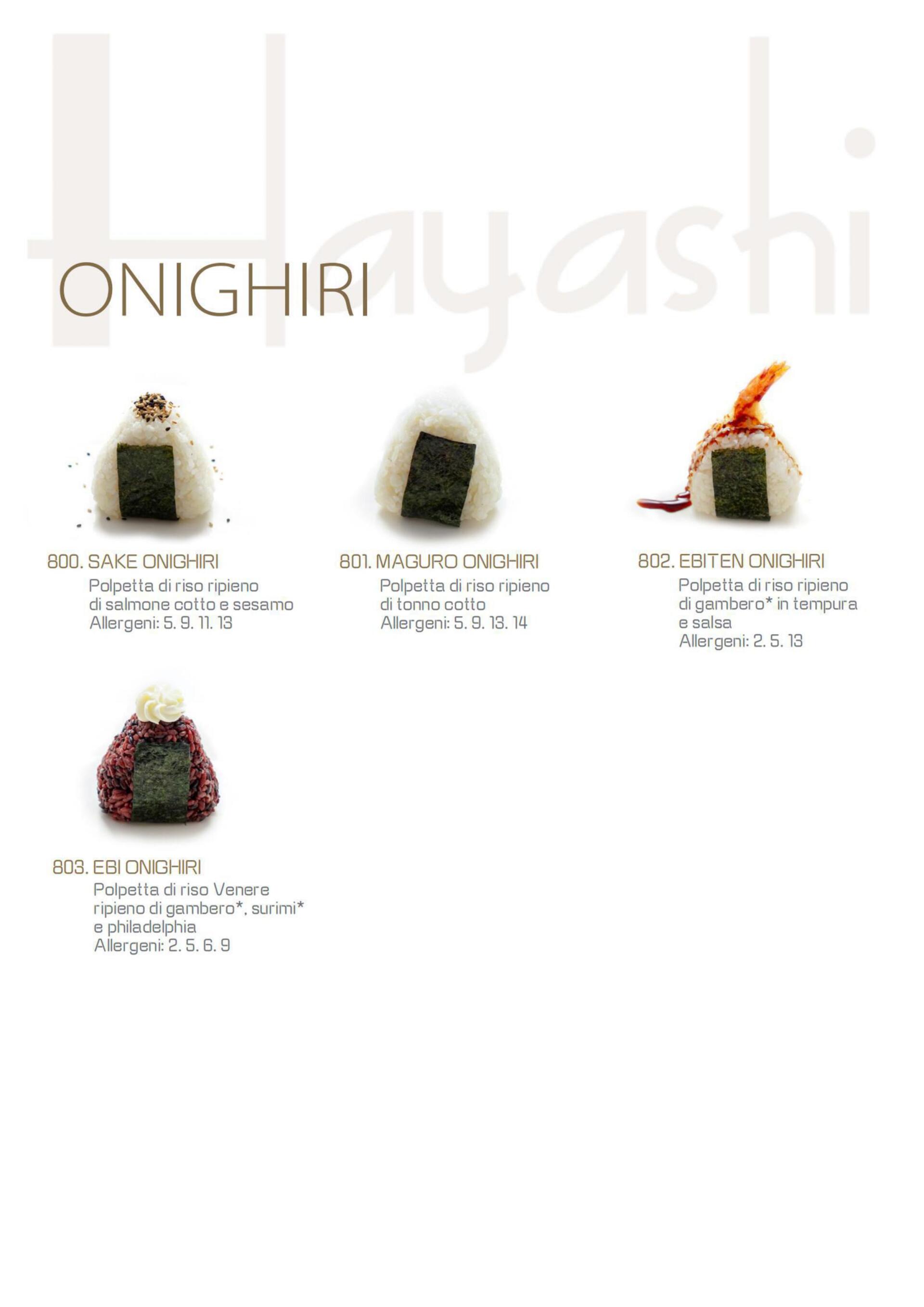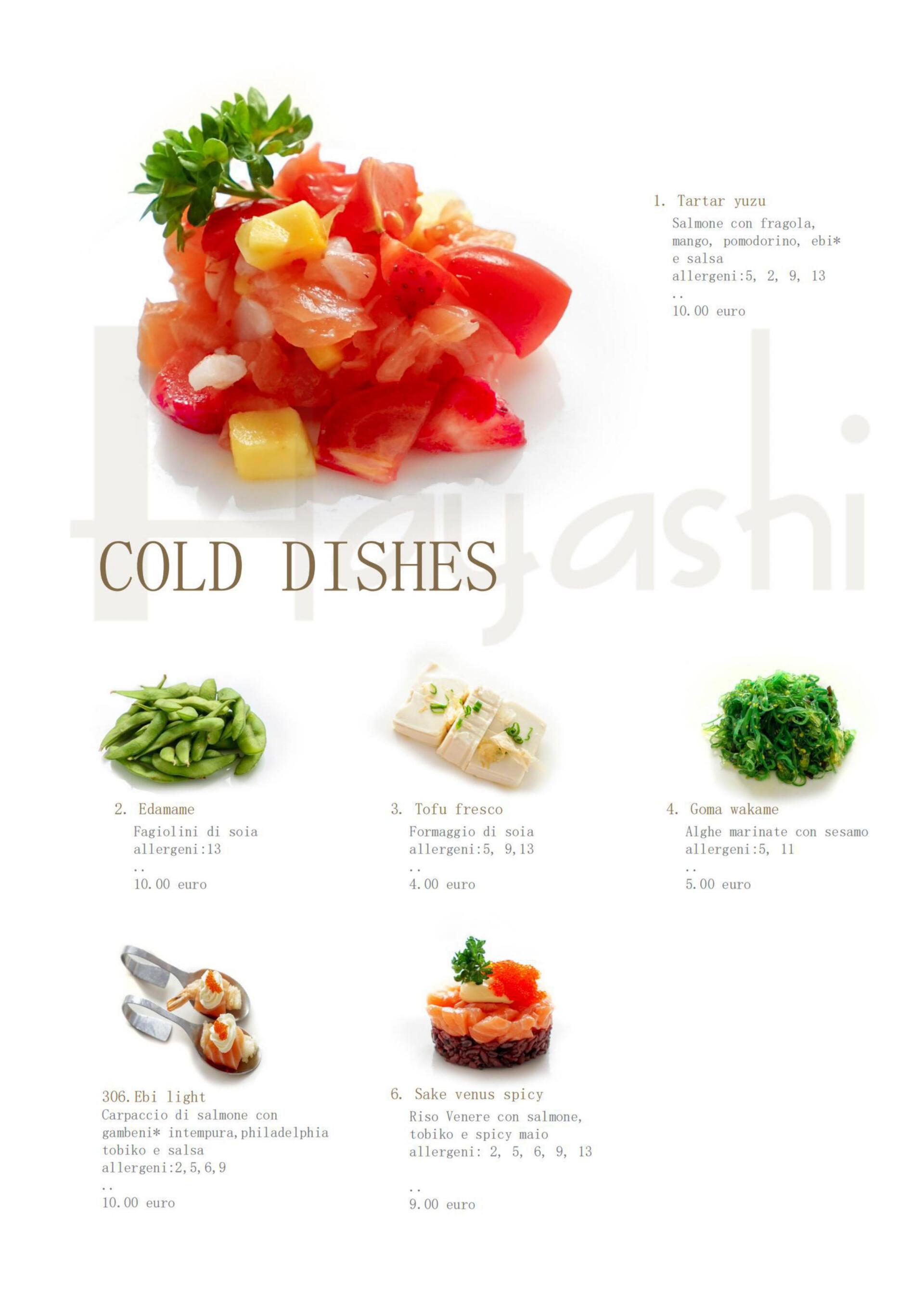 Nel menù troverete antipasti giapponesi e asiatici, primi e secondi piatti orientali, cucina cinese, sushi e sashimi in sfiziose varianti, tempura, zuppe e insalate, piatti e dolci fusion, bevande tipiche, birre e vini pregiati.