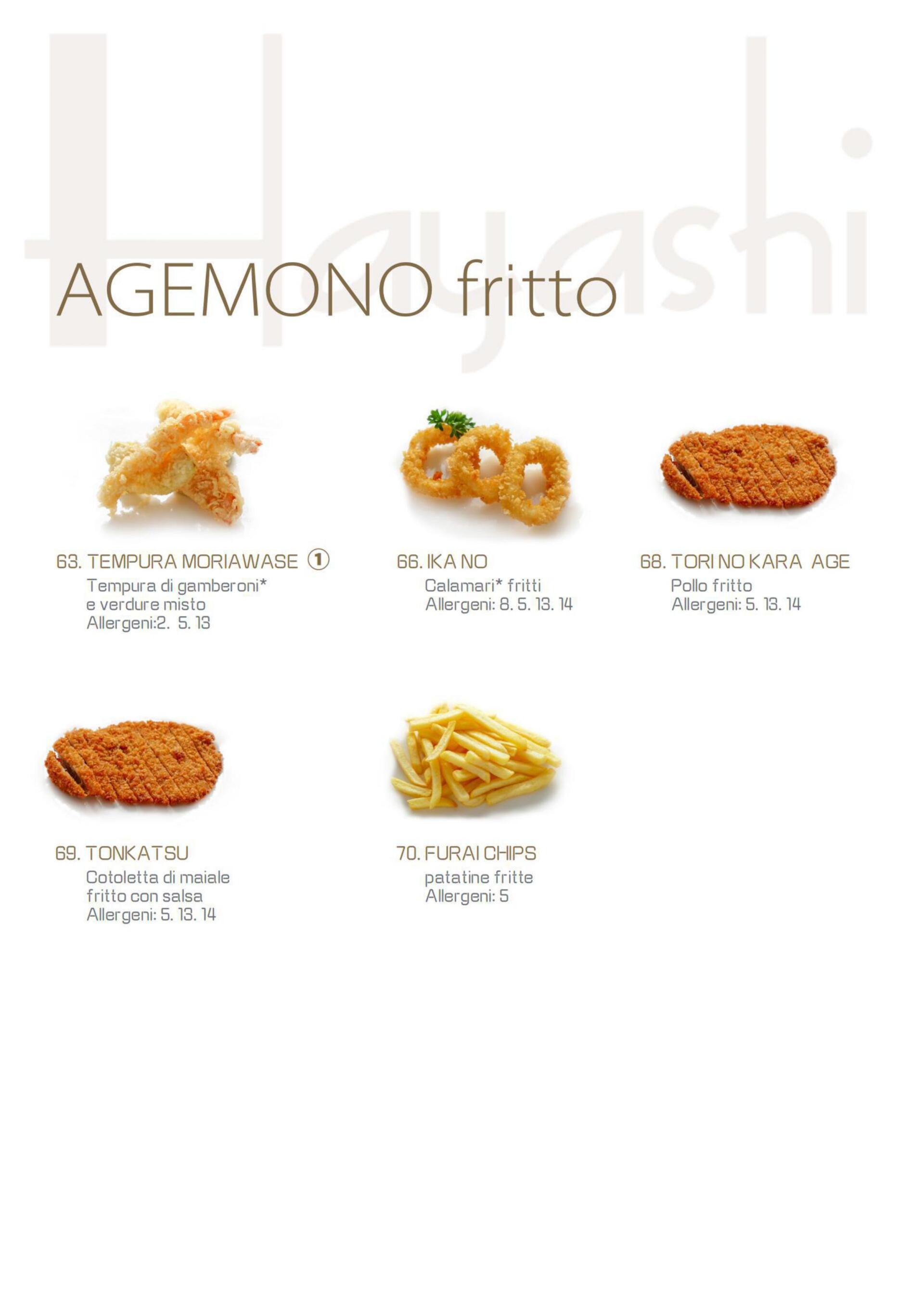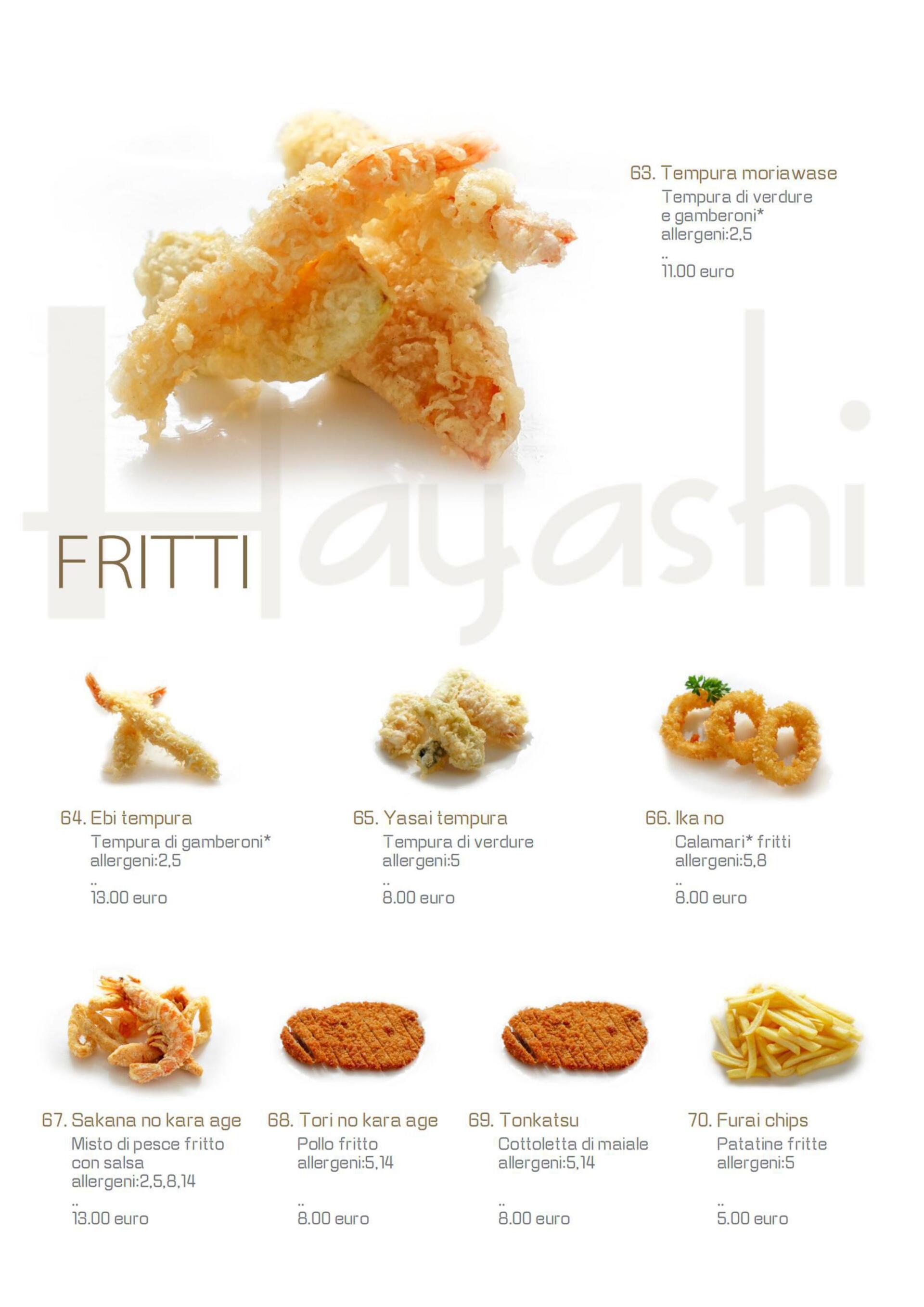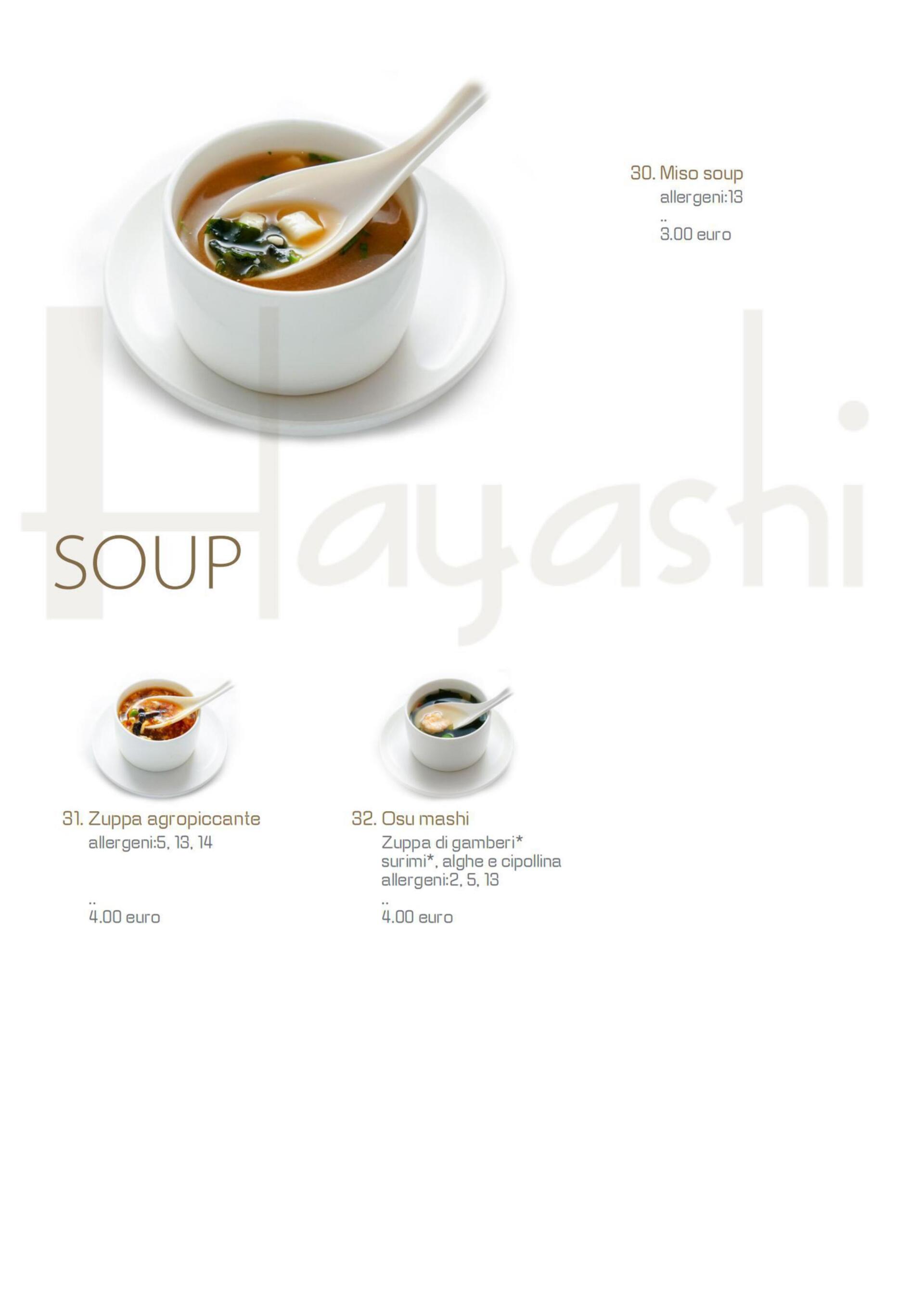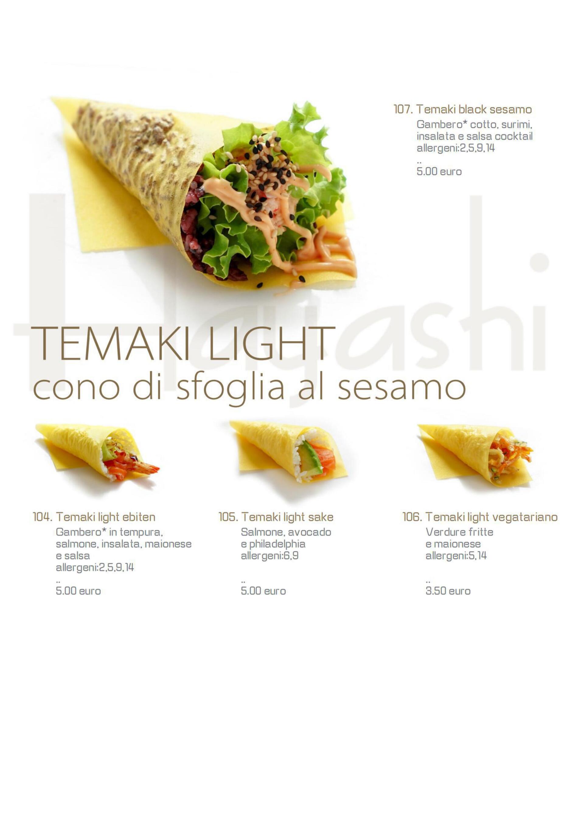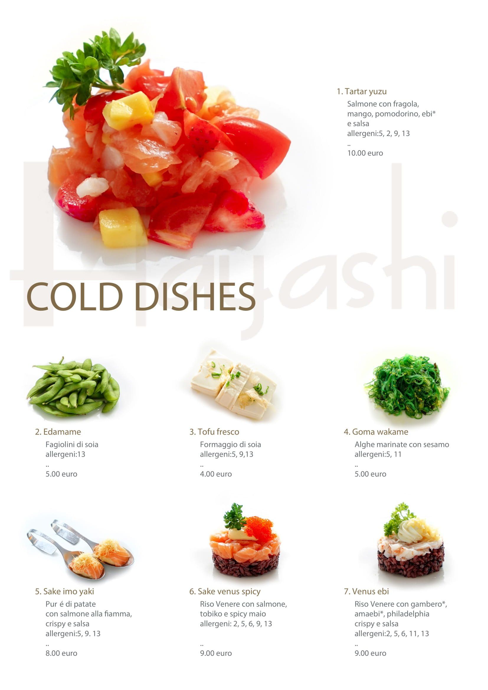 Nel menù troverete antipasti giapponesi e asiatici, primi e secondi piatti orientali, cucina cinese, sushi e sashimi in sfiziose varianti, tempura, zuppe e insalate, piatti e dolci fusion, bevande tipiche, birre e vini pregiati.