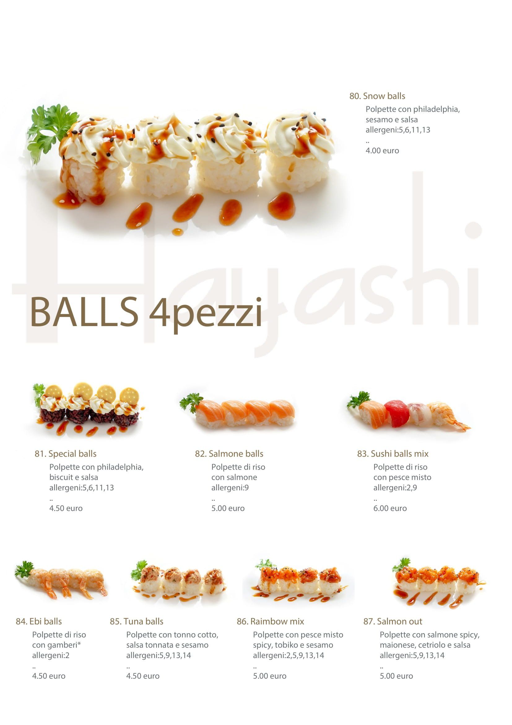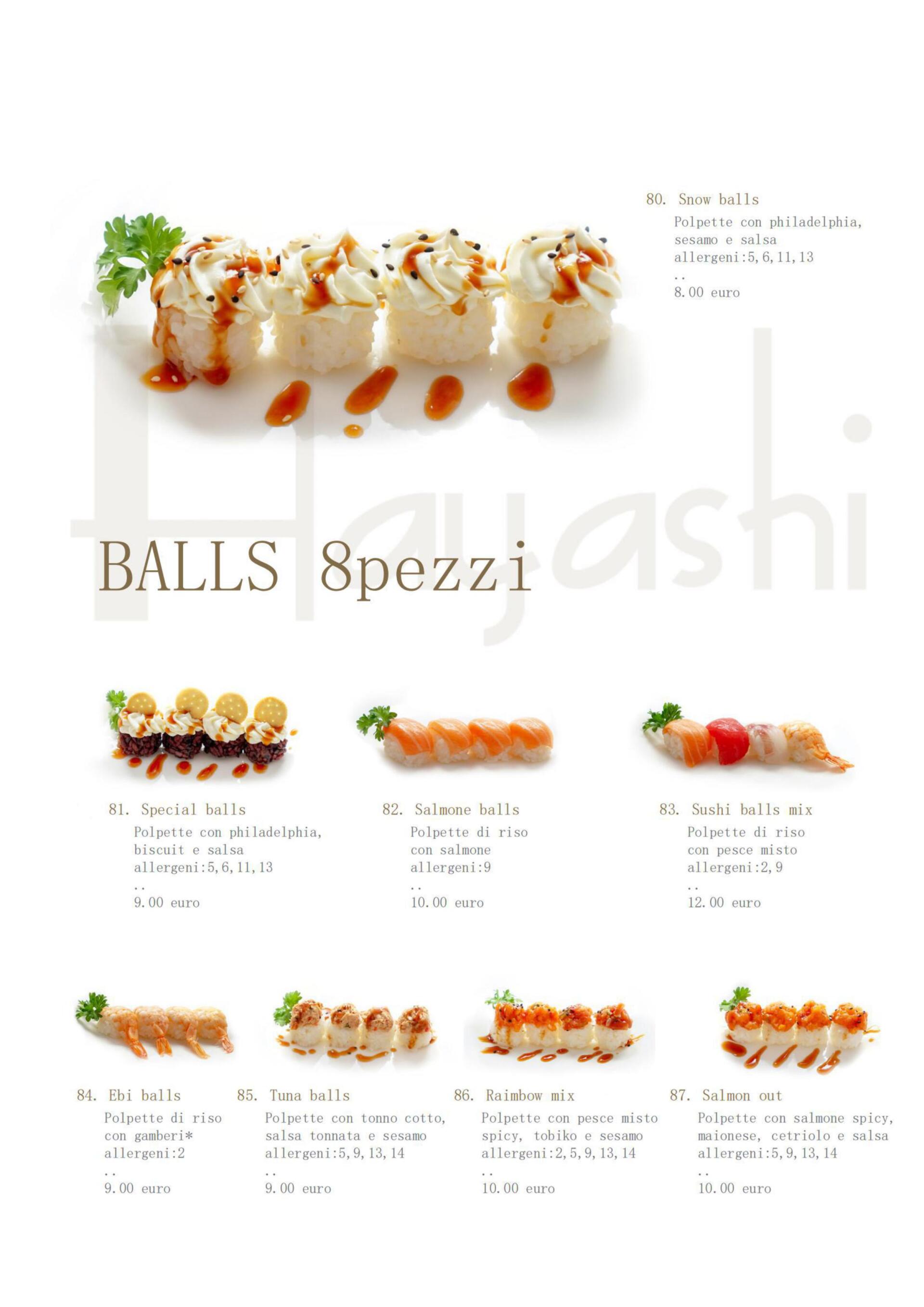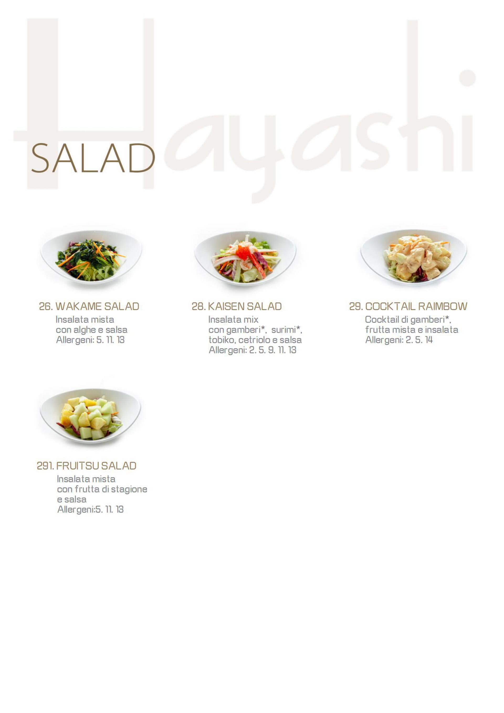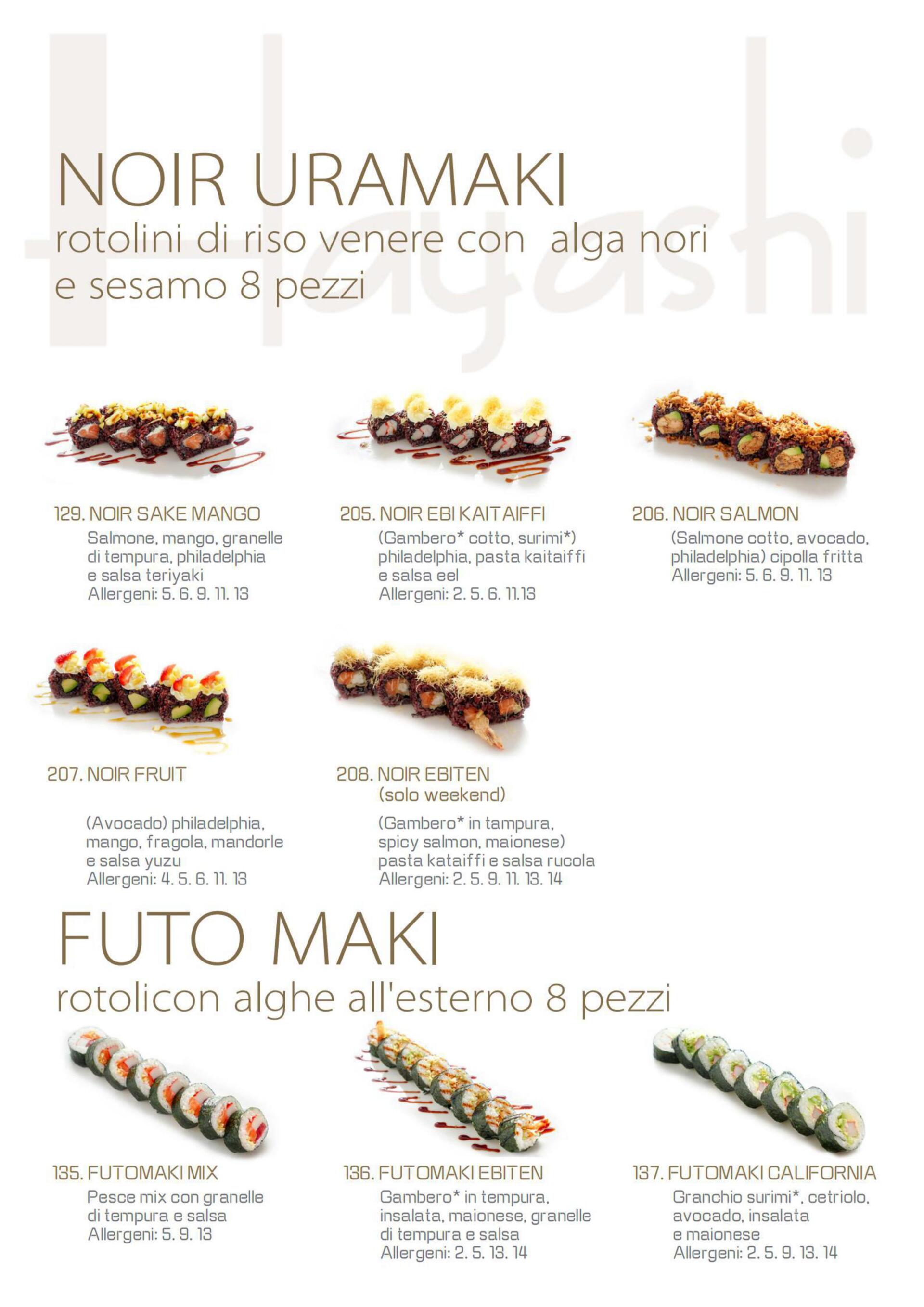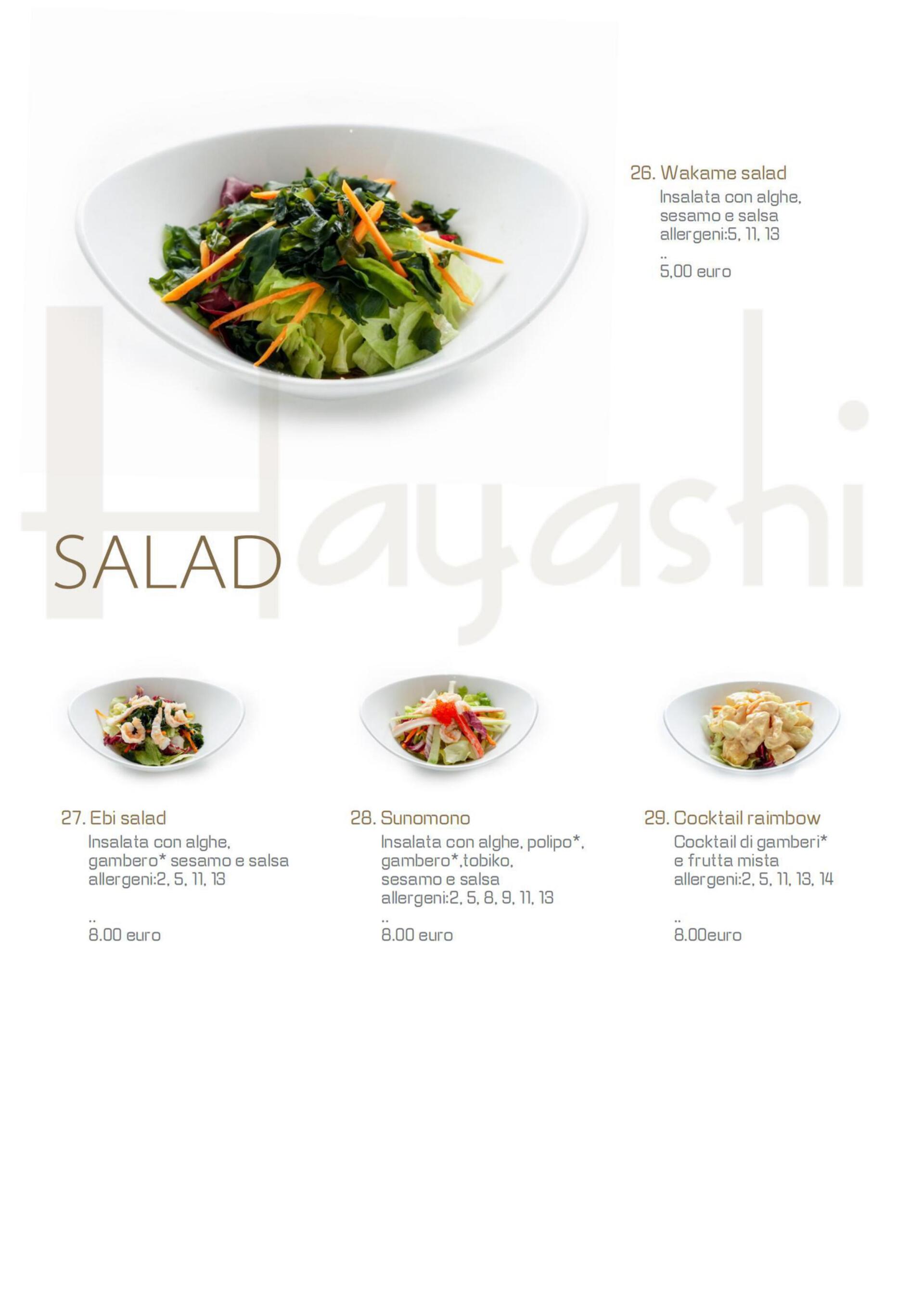 Nel menù troverete antipasti giapponesi e asiatici, primi e secondi piatti orientali, cucina cinese, sushi e sashimi in sfiziose varianti, tempura, zuppe e insalate, piatti e dolci fusion, bevande tipiche, birre e vini pregiati.